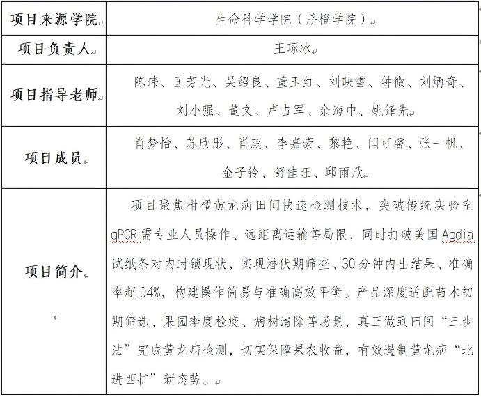 本次大赛,学校共有10885个项目报名参赛,报名项目数、参赛人数均创历史新高。7月,在江西省省赛中,学校取得4金13银38铜,获奖总数列全省第一。经过省赛选拔,学校共有11个项目入围总决赛。在激烈的网评阶段后,我院“环环相鉴——开启柑橘黄龙病即时检测新纪元”项目成功闯入总决赛金奖争夺赛。该项目负责人为2023级园艺学硕士研究生王琢冰,第一指导教师为陈玮博士,这是陈玮以第一指导老师的身份在该赛事上第二次荣获金奖,此次获奖,充分彰显了我院师生运用创新实践服务社会的能力水平,也是学院深化创新创业教育改革、深入推进“四新”建设、服务地方产业发展所取得的重要成果。